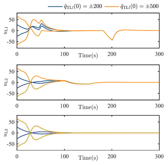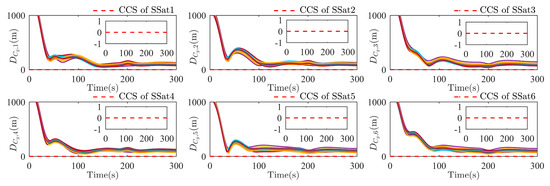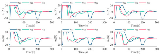 Figure 16 shows the controller command actually applied to each SSat according to Equation (6), which is mainly determined by the TT controller and the CT controller . As it is shown, the actuators of each SSat face saturation status at around 0 s–80 s, which is caused by the huge initial TT error and the initial CT error. Meanwhile, to synchronize with the LSat when the TSat is escaping, all SSats also update their control commands at around 100 s and 200 s.