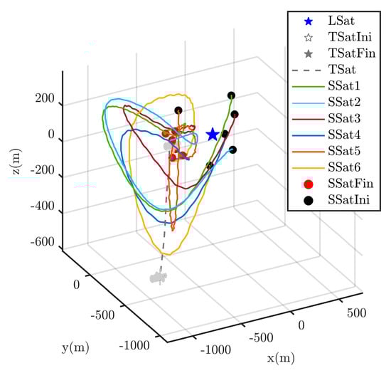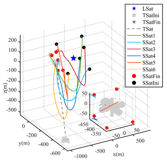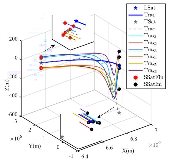 The whole process of the surrounding CT is shown in Figure 9 and Figure 10 with respect to ECI frame and the LSat LVLH frame respectively. Due to the orbit inclination of the LSat are set as 0 deg, clearer distance is shown on the z-axis in Figure 9. In particular, as shown in Figure 10, the control strategies in Equation (6) firstly guarantee the successful surrounding of the escaping TSat. Through the partial zoom in Figure 10, we can see that all the SSats get into the desired position around the TSat while any collision is avoided.