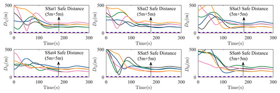 To further check the effectiveness of collision avoidance (including the collision between each SSat with , , and the collision between any SSat and the specific structures of the TSat with , ), the real-time distance between each SSat is shown in Figure 11, and the real-time distance from the th SSat to all modeled structural envelope spheres is shown in Figure 12. As shown in Figure 11, the th SSat can keep the safe distance during the whole surrounding process with the safe range of each SSat being 5 m, which implies that any collision between each SSat is avoided. Then, a collision checking signal (CCS) ( with if and only if the th SSat has a collision with the th envelope sphere) is used in Figure 12 to show the effectiveness of the collision avoidance between all SSats and all envelope spheres. As the distance is reduced along the surrounding process, the CCSs of all SSats are always kept as 0, which illustrates the collision avoidance of the formation with respect to the specific structures of the TSat.