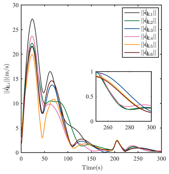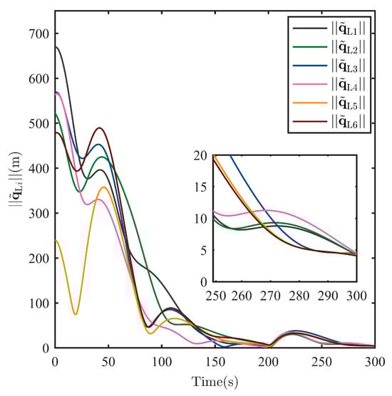 To show the surrounding CT accuracy, the real-time norm of the CT error (including the norm of the position error and the velocity error for all ) are, respectively, shown in Figure 13 and Figure 14. Both the position tracking error and the velocity tracking error shows an asymptotic stability, and the final tracking accuracy at 300 s for position tracking and velocity tracking has reached, respectively, into m and m/s.