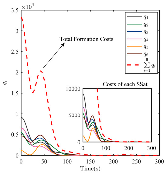 As the most intuitive explanation of all results shown in Figure 9, Figure 10, Figure 11, Figure 12, Figure 13 and Figure 14, responds of the running costs in Equation (12) and responds of the total running cost of the whole formation are shown in Figure 15. From Figure 15, it is shown that both the total running cost and the running costs of each SSat are ensured to be minimized. Note the change at 50 s is caused by the process that . As the total running cost and the running costs of each SSat are minimized to zero, according to their definition given in Equation (12), all the CT error satisfy that , and the collision threat of all SSats are minimized.