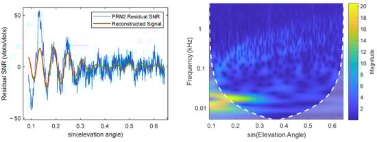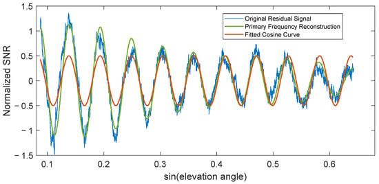 The phase feature parameter is essentially an inherent property of the residual SNR at its frequency f. Frequency bands far from f primarily contribute noise or secondary signals, which, if included in the fitting, would significantly contaminate the estimation of . Therefore, the elevation angle interval selection algorithm in this study calculates the main frequency signal strength and noise signal strength based on wavelet transform, computes their ratio, and determines the selection interval based on a threshold. This reduces the influence of low-quality signals and ensures consistency between the fitting data and the inherent assumption of the single-frequency cosine model (Equation (2)). This interval selection integrates main frequency strength and noise strength, automatically adapting to the characteristics of each satellite’s residual SNR, thereby improving signal utilization.