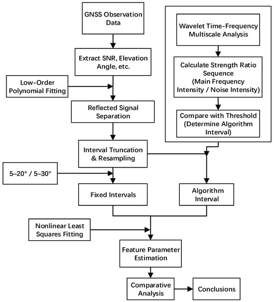 Specific steps are as follows: (1) Process GNSS satellite observation files to extract necessary information such as elevation angle, SNR, and azimuth angle. (2) Fit the trend term using a low-order polynomial to obtain the residual SNR sequence. (3) Extract the residual SNR within the 5–40° elevation angle interval; subsequent interval selection will be performed within this range. (4) Resample the data using the sine of the elevation angle as the variable to achieve uniform sampling. (5) Perform wavelet transform on the resampled residual SNR signal, calculate the main frequency strength and noise strength at different elevation angles, and obtain the ratio sequence. (6) Set a threshold to obtain the maximum contiguous interval where the ratio exceeds the threshold; this interval is the selected interval. (7) Perform fitting to solve for the phase feature parameter. (8) Conduct comparative analysis with the original intervals. The flowchart is shown in Figure 2.