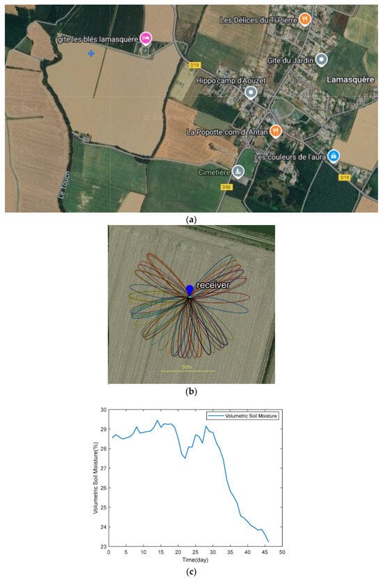 The experimental site is located in southwestern France, near the town of Lamasquère, close to Toulouse. This area is part of the research zone monitored by the CESBIO laboratory (UMR 5126) under the Sud-Ouest project [23]. The region has a mild climate, with temperatures remaining above 0 °C throughout the experiment. The average annual rainfall is approximately 600 mm. A Leica GR25 receiver and an AR10 antenna were installed in a cultivated field in Lamasquère, with the antenna positioned at a height of approximately 1.7 m. Data were continuously recorded at a frequency of 1 Hz for 46 days, from early February to mid-March 2014. The study area consists of bare land, providing an unobstructed environment around the antenna at close range. The terrain is flat with low roughness, characterized by a root mean square height of about 2 cm. Additionally, two soil moisture sensors were deployed on-site, each with an accuracy of 0.01 m3/m3 and positioned at depths of 2 cm and 5 cm, respectively. For this study, signals from the GPS L1 band with strong signal-to-noise ratio (SNR) characteristics [33] were selected for interferometric data analysis. The relevant details of the experimental area are illustrated in Figure 3: (a) the location of the study area, with the blue plus sign in the upper left corner indicating the position of the receiver; (b) the Fresnel reflection zones for different satellite orbits at a satellite elevation angle of 5 degrees. Since most satellites are concentrated near the equator and in low-latitude regions, there is typically a gap in the reflection zone towards the north. When setting up antennas for experiments in the Northern Hemisphere, they are usually placed on the northern side of agricultural fields to receive signals from the south. The situation is reversed in the Southern Hemisphere; and (c) the reference values of soil moisture during the study period. The satellite base map used in the figure is sourced from Google Maps (https://www.google.com/maps/, accessed on 10 May 2024).