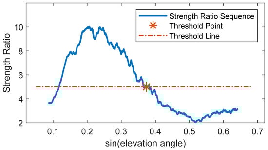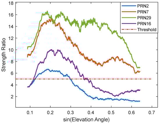 As shown in Figure 5 (Satellite 16), a bright band around 18 Hz indicates the main frequency band where signal energy is primarily concentrated. The brightness of this band decreases from left to right, indicating medium signal strength and attenuation rate for this satellite. Large areas outside this band are considered as noise; these signal components adversely affect feature parameter estimation. The wavelet’s peak frequency is identified, and the average energy intensity within ±3 scale frequencies around it is taken as the main frequency strength. The average energy intensity of other scale frequencies is calculated as the noise strength. Their ratio is then computed. The mean ratio sequence across different days is calculated for each satellite, yielding the elevation angle sequence of the strength ratio for that satellite, as shown in Figure 6.