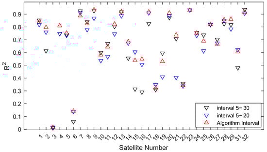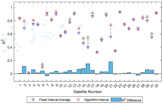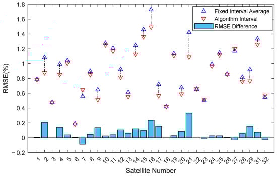 For ease of comparison, the average R2 and RMSE of the two fixed intervals are calculated. In Figure 8, the red upward triangles represent R2 calculated using the algorithm-selected intervals, while the blue downward triangles represent the average R2 of the two fixed intervals. The bar chart below shows the difference in R2 between the algorithm-selected interval and the fixed interval average for each satellite. The chart shows significant improvement for most satellites after interval selection by the algorithm, with only a few showing poorer performance.