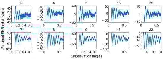 To reduce the impact of multipath effects on positioning accuracy, receiver antennas have low gain for reflected signals from high elevation angles, resulting in higher residual SNR intensity at low elevation angles. Additionally, the Fresnel reflection zone is larger at lower angles, smoothing small-scale surface inhomogeneities (rocks, minor undulations, etc.), which reduces sensitivity to changes in the reflection zone. This also makes the reflected signal of higher quality at low angles. Generally, the waveform of the residual SNR differs slightly among satellites, primarily due to differences in environmental factors. These include the topography and roughness of the reflection zone, reflections from other areas, the condition of the cover above the reflection zone, and satellite signal obstruction. If these conditions deviate significantly from the ideal, they can adversely affect the signal. For example, excessive terrain undulation in the reflection zone may prevent the residual SNR signal from forming a complete periodic fluctuation, rendering the model invalid and making it difficult to locate the actual reflection zone. Reflections from other areas (e.g., nearby buildings or mountains) can impose high-frequency fluctuations on the residual SNR signal. If the reflection zone has vegetation cover, it can weaken reflected signal strength and introduce vegetation interference [6]. Signals in high elevation angle intervals are more susceptible to environmental influences due to weaker reflected signal strength and smaller Fresnel reflection zone areas [31], with the specific impact location varying depending on the environment.