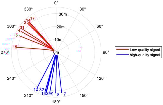 Satellites with short intervals (e.g., 2, 4, 5, 14, 15, 17, 31) and satellites with long intervals (e.g., 7, 8, 9, 12, 13, 29, 32) were summarized. Their residual SNR signals are shown in Figure 14. The latter group generally exhibited higher retrieval correlation and accuracy, while the former group had lower performance. This difference stems from the spatial heterogeneity of reflected signal quality with satellite azimuth and Fresnel reflection zone location. Figure 15 shows a schematic of the azimuth paths covered by satellites with long and short intervals. Although the experimental site was flat overall, unavoidable regional heterogeneity in surface characteristics (e.g., tillage marks, local ground undulations) existed spatially. This heterogeneity introduces regional effects on the reflected signal: areas that are closer to an ideal reflecting surface (e.g., the lower region in Figure 15) tend to produce clear interference patterns with high SNR (i.e., high-quality signal zones). In contrast, other areas (e.g., the left region in Figure 15) may exhibit greater surface roughness in that specific region or direction. Increased surface roughness enhances signal scattering and reduces the power of the reflected component, thereby leading to attenuated residual SNR signal strength and waveform distortion.