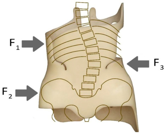 - Pham, V.M.; Houilliez, A.; Schill, A.; Carpentier, A.; Herbaux, B.; Thevenon, A. Study of the pressures applied by a Chêneau brace for correction of adolescent idiopathic scoliosis. Prosthet. Orthot. Int. 2008, 32, 345–355. [Google Scholar] [CrossRef] [PubMed]