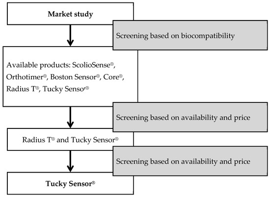 Following the decision tree outlined in the methodology, the Tucky® device was selected, as shown in Figure 2. A qualitative summary of the sensors selected in the market study is shown in Table 1.