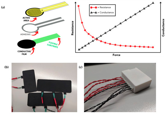 (a) Diagram of the FS401BE® sensor operation; (b) pressure sensor using FSR01BE® technology (c) with the acquisition board.