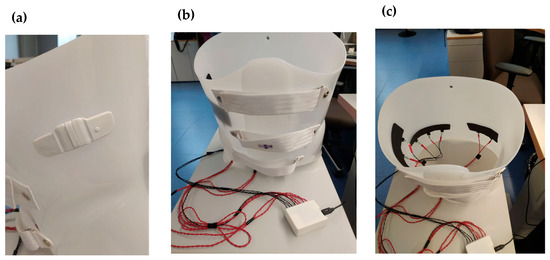 Due to its size, the system could not be organically integrated into a standard Boston brace. Instead, the system was temporarily installed during each check-up to assess brace adjustment. The selected pressure points were marked on the brace to ensure accurate, repeatable measurements. The sensors were covered with PSP Dacron11 adhesive tape to protect them without compromising sensitivity (Figure 4b,c).