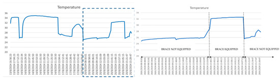 Figure 5. Images obtained from the Tucky® application. If the sensor is connected to the mobile device via Bluetooth, it can continuously capture the temperature and upload it to the cloud. The moments when the brace is being worn and when it is removed can be clearly identified.