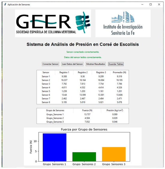 Figure 6. Screenshot obtained from the Spanish-language application designed for adjustment evaluation. Entitled System of Pressure Analysis of Scoliotic Brace, it presents an interface that allows the user to connect the sensor, read the data, display the results, and save the results table. In addition, it provides a graphical representation of the force, in Newtons, recorded by each group of sensors.