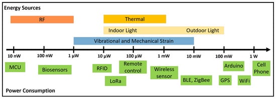 Comparison of power density ranges for various energy sources and power consumption ranges of common electronic devices. Colored horizontal bands indicate the typical or potential power densities (in W/cm3 or W/cm2) and power requirements of typical low-power modules. Data from [14,15,16].