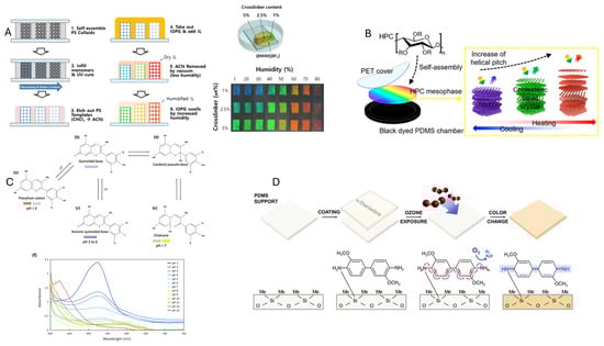 Fiber Bragg gratings and waveguides, although widely used as photonic crystal-based optical sensors, require light to be coupled into the fiber. This limits their compatibility with ambient illumination conditions [107]. In contrast, passive sensors typically rely on multilayer structures deposited on a substrate to form 1D PhCs [108,109,110] or on self-assembled sub-micron particles forming opal-like 3D PhCs [111,112]. In this category, temperature and humidity sensors are the most common. Recently, using multilayers of vinyl polymers with different refractive indexes, Jung et al. [108] demonstrated a chemically tunable device able to measure humidity in a 10 to 90% RH range, with a response in the order of seconds (Figure 4A). A similar material shows simultaneous responsivity to both temperature and humidity, although reducing specificity [110]. A layered structure is also present in cholesteric liquid crystalline, where the pitch of the characteristic helicoidal structure can depend on external parameters. Using the biodegradable polymer hydroxypropyl cellulose, Yi et al fabricated a stable device operating between −20 and 25 °C, a temperature range suitable for environmental monitoring [109] (Figure 4B).