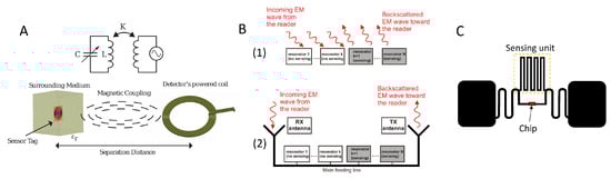Passive radio frequency (RF) sensors derive the necessary energy for sensing and communicating directly from the interrogating signals emitted by a reader [119]. This powering method eliminates the need for onboard energy storage, making them suitable for long-term, low-maintenance deployments, especially in remote or inaccessible locations. This section will explore the most promising passive RF technologies, examining their operational principles and highlighting notable applications from the recent literature. We will cover inductor–capacitor (LC) resonant sensors, radio frequency identification (RFID) based sensors, and surface acoustic wave (SAW) sensors.