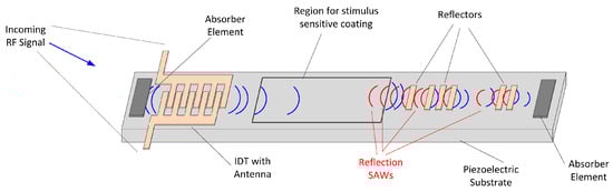 - Delay Line: In this architecture, the wave can travel to a second, separate IDT for conversion back to an RF signal. Alternatively, in a reflective delay line, it is reflected back to the original IDT. By introducing multiple reflectors to create a unique pattern of reflected signals, a SAW device can also function as a time-encoded RFID tag [125]. Delay line sensors operate by measuring changes in the signal’s time delay or magnitude.