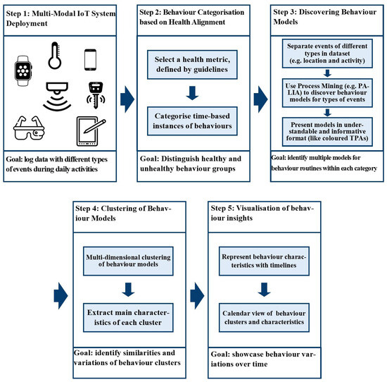 The schematic view of the proposed five-step approach, from multimodal IoT data collection to behaviour visualisation and analysis.