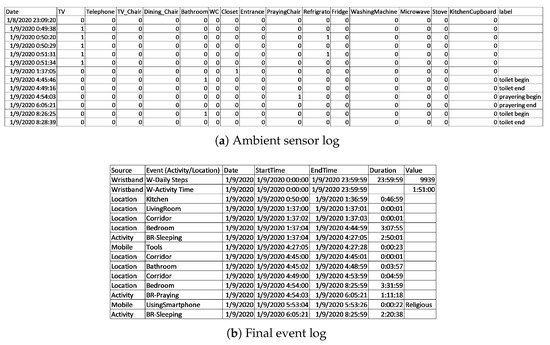 The sensors in the house are used to perceive the environment, e.g., the activities performed by the resident, during the day. The installed devices are 15 binary sensors positioned on furnishing elements, appliances, and doors. Indeed, the ambient sensory information includes readings from multiple PIR sensors showing the presence of the subject in different areas of the solo-resident house and some activities performed in these areas (like praying or using telephone), a power usage sensor indicating TV usage, contact sensors highlighting the opening and closing of the bathroom, WC, and closet doors, and a gas detection sensor detecting cooking activity. In addition, with the aid of a mobile application, smartphone usage information is collected to show the timestamps of mobile usage and the names of the used applications. Also, the subject wore a wristband (Xiaomi Mi Band 3) to track daily walking steps during data collection.