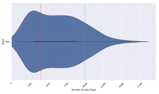 However, the recommended daily step count varies across studies, typically ranging between 4000 and 18,000 steps. Among these, a target of 10,000 steps per day has been widely recognised as a reasonable benchmark for healthy adults [61]. Recent large cohort studies (including [62]) also suggest that benefits begin at around 4000 steps/day, with higher increments providing greater protection against mortality risks.