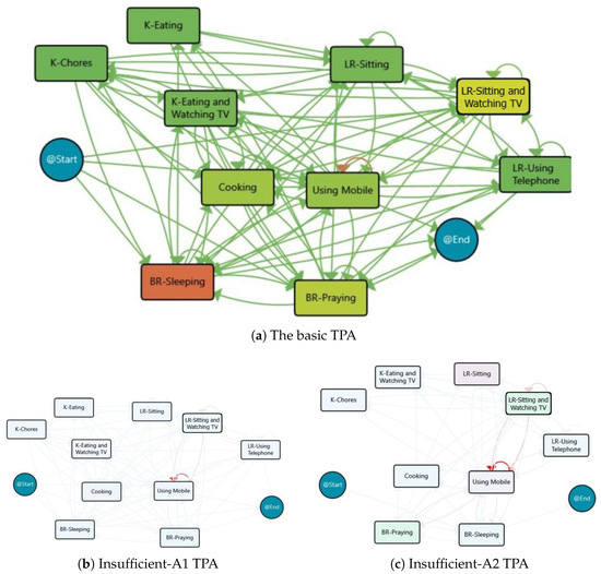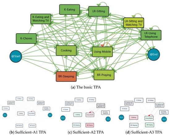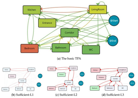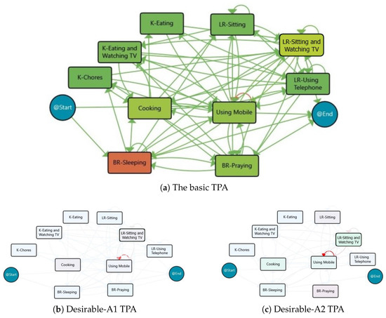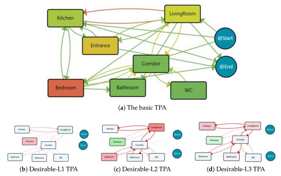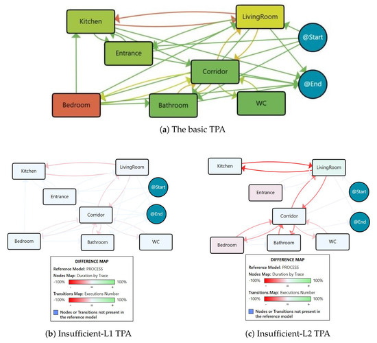 Thirdly, we discover behaviour models for each set of behaviour routine instances, categorised based on the defined health measures. We consider all of the traces and their corresponding behaviour models in each category to better understand the patterns within that group. This step involves looking at different types of events recorded by our system, like the location of the person and the activity they are engaged in at a given time, and linking them together based on their time correlation. In fact, multiple event types can describe a single behaviour, which assists us in acquiring multiple models for each behaviour routine, highlighting more information to create comprehensive behaviour models. This approach lets us consider the diverse facets of a person’s behaviour in an interconnected way. By leveraging PM techniques, particularly the PALIA algorithm, we create easy-to-understand models in the form of TPAs. These TPAs, equipped with heatmaps representing duration, reveal differences between routines in a clear and understandable manner for healthcare professionals.