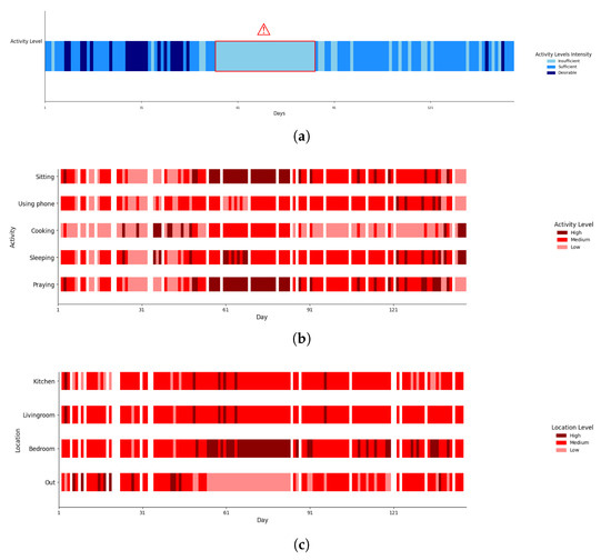 In our study, we therefore defined two thresholds based on both the literature and the observed distribution of step counts in our dataset. Days with less than 4000 steps were categorised as Insufficient, 4000–10,000 as Sufficient, and higher than 10,000 as Desirable. This categorisation reflects both established guidelines and the variability in our case study, while acknowledging that the ideal thresholds may vary depending on age, weight, and overall health status [60,61]. The daily step count data collected by the wristband is used to determine three distinct physical activity levels: