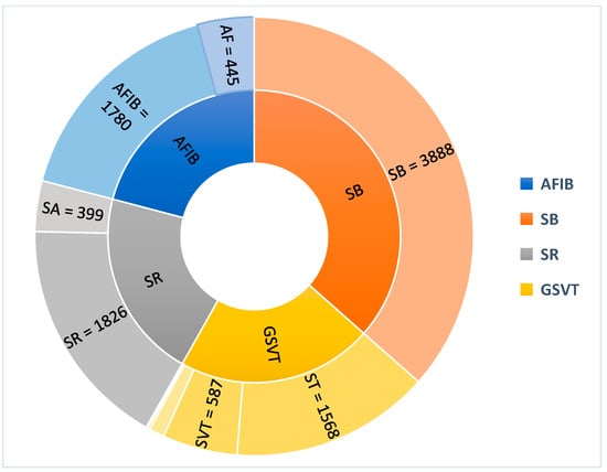 The distribution of data into the 11 classes, respectively, and their division into 4 main heart rate classes (AFIB = Atrial Fibrillation; SB = Sinus Bradycardia; SR = Sinus Rhythm; GSVT = General Supraventricular Tachycardia).
