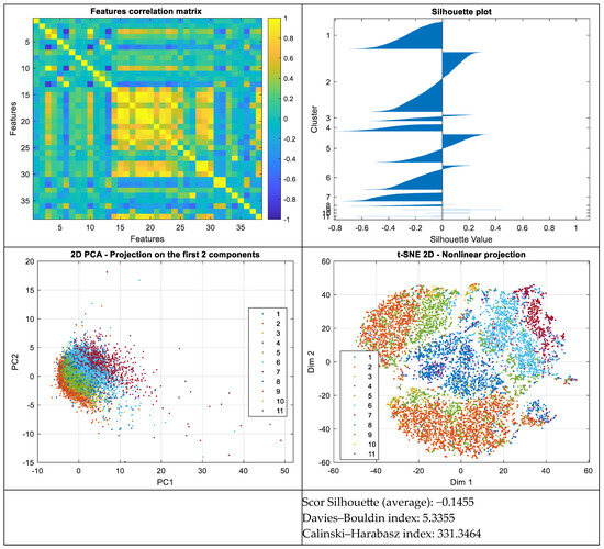 The Calinski–Harabasz Index (CHI) registered a value of 331.3464, which is noticeably lower than that obtained for the classification into four classes. This relatively low score indicates that the data does not form compact and well-separated groups, suggesting that the division into 11 classes may represent an artificial over-partitioning of a feature space lacking an inherent multi-class structure.