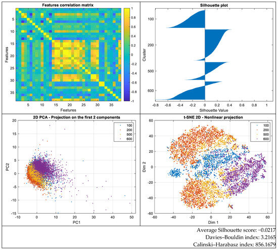 The analysis of clustering evaluation methods indicates weak separability of the data into four classes, as evidenced by a negative mean Silhouette score (−0.0217), a relatively high Davies–Bouldin index (3.2165), and a moderate Calinski–Harabasz value (856.1679). These results suggest that clearly delineating classes within the current feature space is challenging, and achieving high classification accuracy is unlikely without further feature transformation or selection.