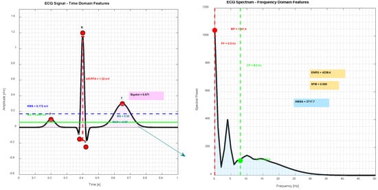 The aim of this study is to analyze and compare different types of features extracted from ECG signals, with respect to their utility in automated classification tasks. Specifically, we investigate the performance of traditional features—such as QRS duration, QT interval, ventricular rate, atrial rate, R axis, T axis, Q onset, Q offset, and T offset—in relation to an extended set of modern features derived from the time domain, frequency (spectral) domain, and nonlinear analysis of the signal [9,10]. This comparison seeks to highlight the substantive potential of advanced features in enhancing computer-aided diagnostic systems, particularly within the frameworks of big data and machine learning. By integrating these complementary perspectives, the present study contributes to a more comprehensive understanding of how temporal, spectral, and ECG signal complexity features can be effectively combined with classical morphological characteristics—such as wave shape and onset/offset timings—to improve automated classification, facilitate early pathology detection, and support clinical decision-making.