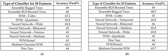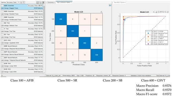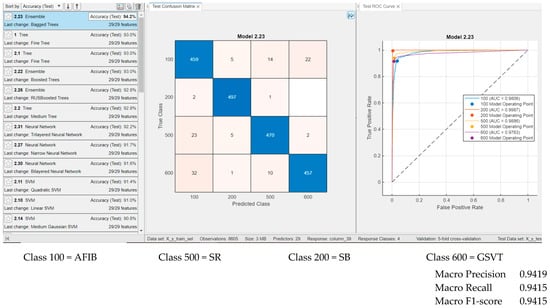 Table 2 summarizes the classification results. It can be observed that the features proposed in this study yield comparable accuracy to those reported in ref. [11]. In addition to temporal features, spectral features, and nonlinearity measures, several frequency- and waveform-related features were identified as relevant, such as ventricular rate (BPM), atrial rate (BPM), QRS duration, QT interval, and corrected QT interval.