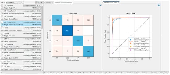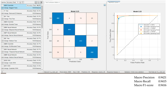 Results for classifiers achieving the best performance in four-class classification using 15 features selected by the ReliefF algorithm and evaluated on a test set representing 20% of the data (80:20 train–test split). The classification rate is 93.3%. Feature importance scores from ReliefF, the validation confusion matrix, and the validation ROC curve are shown for the best-performing model, the Narrow Neural Network.