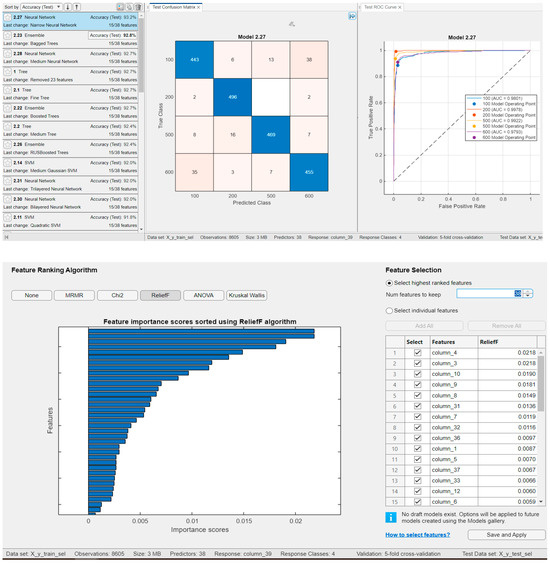 Results for classifiers achieving the best performance in four-class classification using 15 features selected by the ReliefF algorithm, evaluated on a test set representing 20% of the data (80:20 train–test split). The classification rate is 93.3%. Feature importance scores from ReliefF, the test confusion matrix, and the test ROC curve are shown for the best-performing model, the Narrow Neural Network.