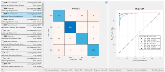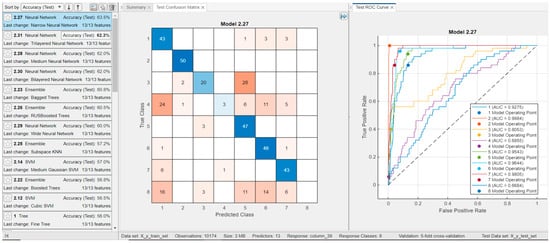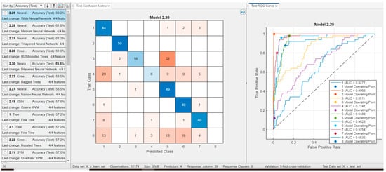 Figure 14 and Figure 15 present the results of splitting the data into training and testing sets with an 80:20 ratio (as described in paper [11]), showing the confusion matrix and ROC curve for the validation set and, respectively, the test set for the Narrow Neural Network, which achieved a performance of 93.3% on the test set. The validation and test sets yielded similar results, indicating that the model is not overfitting and demonstrates good generalization capability.