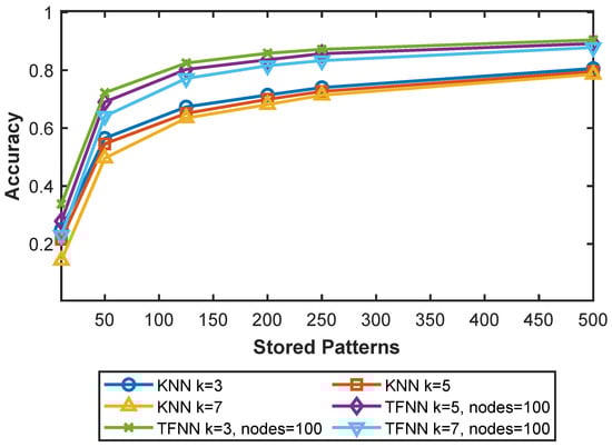 Accuracy comparison between traditional k-NN and TFNN using 100 IoT nodes, evaluated at , , and while increasing the number of stored patterns from 10 to 500 patterns.