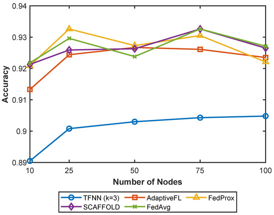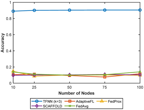 Table 2, Table 3 and Table 4 present the classification accuracy of AdaptiveFL, FedProx, SCAFFOLD, FedAvg, and the proposed TFNN () under both IID and Non-IID partitions of the MNIST, CIFAR-10, and CIFAR-100 datasets. The simulations were conducted over 200 communication rounds with network sizes ranging from 10 to 100 IoT nodes, where each node stored 500 patterns.