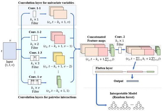 This approach is repeated across all variable pairs, with Conv. 1–v using the filter to extract pairwise interaction features. The number of columns of the feature maps passed through Conv. 1–v is 1. These feature maps contain the pairwise interaction features of the first and last (vth) variables.
