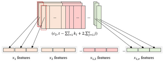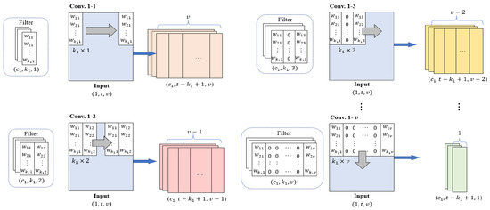 In Conv. 1–1, the convolution filter of size moves to the right by one stride to extract the features of the individual variables. The first column of the output feature maps from Conv. 1–1 contains the features of the first variable.
