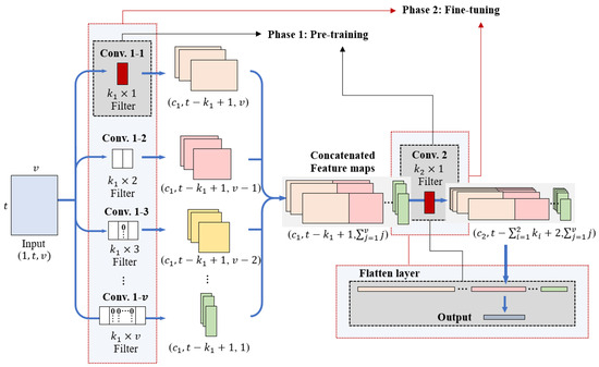 The convolution filters in the parallel convolution part had the same height and number of channels and differed only in the width of the filter. In Figure 1, the heights of the convolution filters of Conv. 1–i and Conv. 2 are expressed as and , and the number of channels as and . Similar to a general CNN model, the height, width, and number of channels of the convolution filters were determined as hyperparameters and could be specified differently by the user according to the complexity and size of the input data. However, the same height and number of channels had to be applied to the convolution filters in Conv. 1–i. The stride of all convolution layers in the InCNN was set to 1, and the padding size was set to 0.