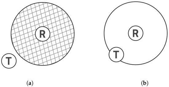 (a) T—transmitter, located outside the range of antenna R (receiver). (b) T is within the range of R. In this case, it is possible to determine the area where T is located.