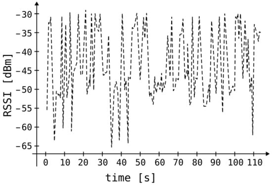 A significant part of indoor systems employing Bluetooth beacons relies on RSSI. In theory, RSSI values received at the receiver can be converted into transmitter–receiver distances through a mathematical model based on Bessel functions [28]. However, practical implementation faces challenges stemming from the equation’s reliance on numerous environmental variables. Operating such a system indoors, where elements like windows, walls, doors, furniture composed of diverse materials, and human movement abound exist, poses difficulty in meeting anticipated performance levels due to the complexity of variables involved. Figure 2 depicts the relationship between received signal strength and the distance separating the transmitter and receiver [29]. The black, solid curve represents the mathematical model based on Bessel functions between these values. The black dots represent signal strength measurements taken at different distances. The dashed lines show the standard deviation from the solid curve. For instance, an RSSI of −75 dBm corresponds to distances ranging from 50 to 100 m. The RSSI value is subject to significant temporal fluctuations. Figure 3 depicts sample measurements performed in our laboratory that demonstrate RSSI value changes over time when both the transmitter and receiver are stationary.