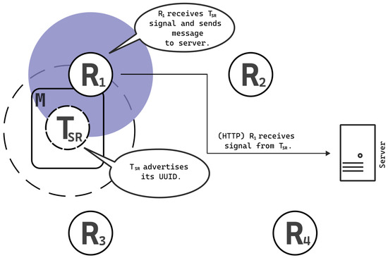 A user utilizes a mobile device to function as a beacon, transmitting packets for advertising purposes. Upon detecting the beacon signal, receivers communicate with the server through the HTTP protocol to relay the information. In this scenario, the transmitter operates at low power, limiting its range to reach only R1. The gray, transparent circle around receiver R1 represents the estimated antenna pattern, while the dashed circle around transmitter TSR indicates its range.
