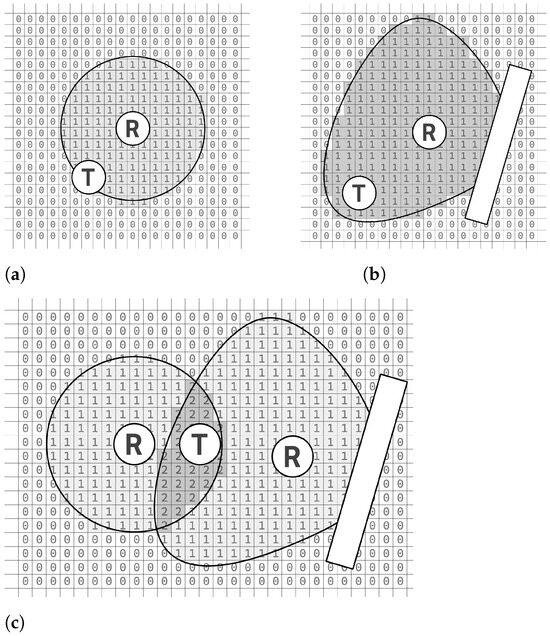 Subsequently, the server conducts an analysis of the received data on a two-dimensional plane. This implies that the plane utilized for localization is partitioned into squares, each possessing a side length denoted as a (with a default assumed value of m). This grid is filled with binary values, zeros and ones, to mimic the spatial distribution of the receiver’s signal coverage. This procedural step is elucidated in Figure 6a,b.