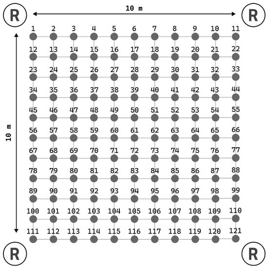 The arrangement of transmitters (gray dots) at measurement points and receivers on a square ( m) grid with dimensions of m.