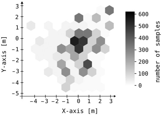 In the initial static experiment, we positioned receivers at the corners of a square grid measuring m and recorded measurements of the transmitter’s position at intervals of 1 m (see Figure 9). A total of 121 sets of static measurements were collected, corresponding to an grid. We assessed the system’s accuracy in this context by measuring the Euclidean distance between the point determined by the algorithm and the actual object location. We compared our results of static experiment with the HIL algorithm published in [16]. Approximately 25% of the samples exhibit errors not exceeding 1.5 m, while the maximum error for all samples is 5.2 m. The average error is 1.83 m, with a median of 1.73 m and a mode of 2.35 m. Error distribution along the X and Y axes is depicted in Figure 10. Corresponding numerical values are provided in Table 1. Although the null hypothesis regarding the normality of error distributions along the X and Y axes could not be confirmed through the Kolmogorov–Smirnov test, the clustering of the majority of samples around zero error in each dimension supports the efficacy of the centroid as a reliable estimator for mobile device localization.