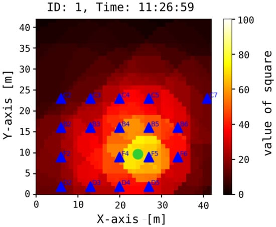 The outcome of the operational system at time t for device is depicted. Darker areas indicate a lower probability of the object’s presence, while lighter squares suggest a higher likelihood of object occurrence. The green dot represents the centroid of squares with the highest probability. Additionally, blue triangles denote receivers that received signals from any of the transmitters identifying the object.