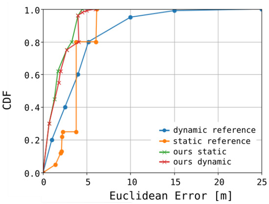 Our analysis revealed that, with a signal sampling interval of 1 s, the mean measurement error was 4.1 m for 80% of the samples, while the maximum observed error reached 6.8 m. The system’s performance over a specified time interval, denoted as , is illustrated in Figure 11. Figure 12 presents both the reference trajectory and the actual trajectory of the moving object. The distribution of Euclidean errors is depicted as a histogram in Figure 13, whereas Figure 14 shows the corresponding cumulative distribution function (CDF), in comparison with the static variant of our algorithm as well as the approaches reported in [3,16]. The numerical results associated with these findings are summarized in Table 1.