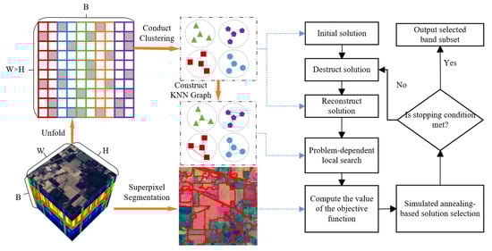 In this section, we provide a detailed description of the proposed SSIGA method. Figure 1 gives a schematic illustration of SSIGA. As shown in Figure 1, SSIGA first performs superpixel segmentation on the original hyperspectral data, utilizing spatial consistency to aggregate pixels into local regions while preserving spatial structural information. In addition, the three-dimensional hyperspectral data is unfolded into a two-dimensional matrix, where clustering analysis is conducted based on spectral similarity, and a set of K-nearest neighbor graphs is constructed based on the results of clustering analysis according to the similarity between bands. During the optimization process of SSIGA, an initial band subset is first selected based on the clustering results. Then, a destruct–reconstruct strategy is applied, where a portion of the bands is randomly removed from the current solution and a new band subset is reconstructed. Next, a problem-dependent local search is performed on the current band subset to further optimize the band selection scheme. For each candidate solution, the objective function value is calculated based on spectral discriminability, information entropy, and mutual information to evaluate the classification performance, information content, and redundancy of the selected bands. Finally, to prevent the search from falling into local optima, SSIGA employs simulated annealing as the acceptance criterion, accepting or rejecting new solutions based on probability to achieve global optimization. The algorithm iteratively executes this optimization process and outputs the final optimal band subset once the stopping condition is met. The complete iterative optimization workflow is summarized in Algorithm 2.