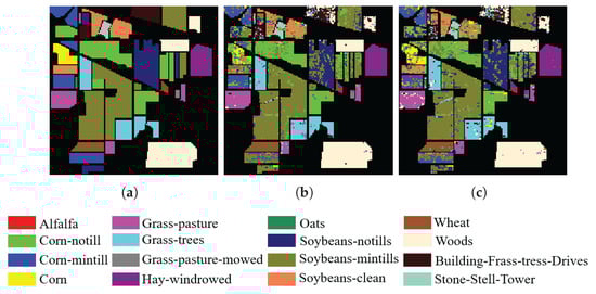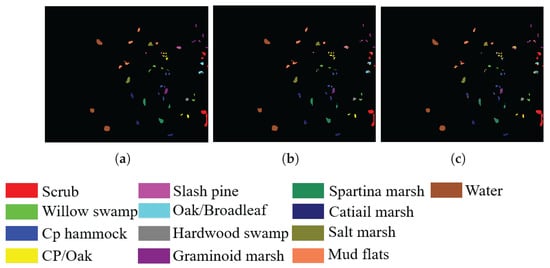 Figure 10. Ground truth map and classification maps of SSIGA on the KSC dataset. (a) Ground truth. (b) Using SVM. (c) Using RF.
